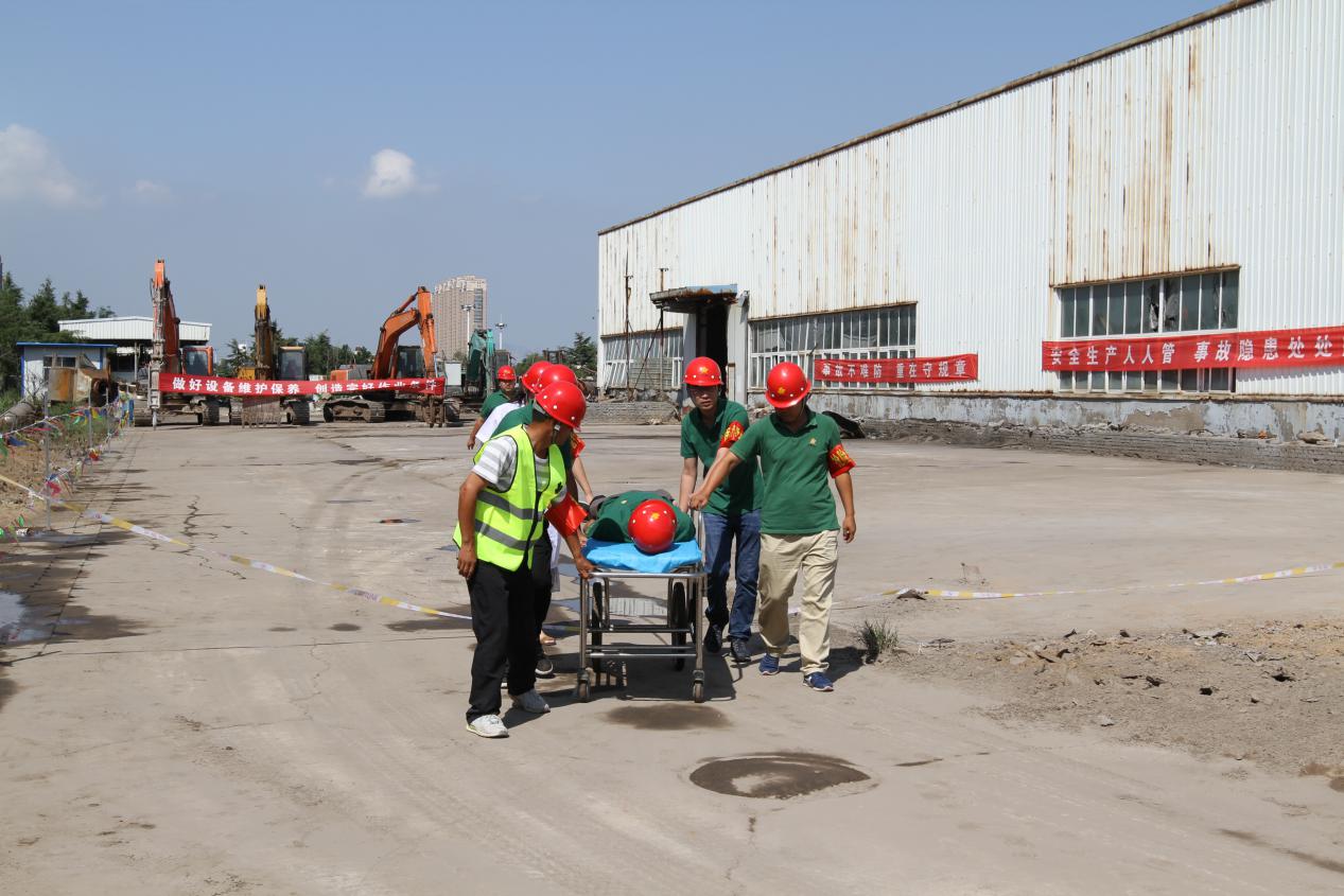 上午9時40分,開始高空墜落事故應(yīng)急演練。綠茵環(huán)保有限公司拆除項目部工人模擬從高空墜落,施工現(xiàn)場專職安全員發(fā)現(xiàn)后,現(xiàn)場查看情況后,急忙打電話向管理人員報告,啟動應(yīng)急預(yù)案,撥打120求救;人員疏散組組織人員撤離,安全警戒組設(shè)置警戒線防止其他工人進入危險地點;醫(yī)療救護組立刻到達事發(fā)地點并進場用擔(dān)架救出傷者,送往醫(yī)院;事故勘察組對事故產(chǎn)生的原因進行調(diào)查、拍照、取樣,并做詳盡的記錄、分析。上午10時進行消防應(yīng)急演練,按演練程序及時報告、處置撲滅現(xiàn)場火災(zāi)。
