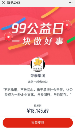 95日至15日,為加強(qiáng)企業(yè)文化建設(shè),奉獻(xiàn)榮泰人的愛心,建設(shè)“仁者愛人、與人為善”的富有人文關(guān)懷的慈善愛心企業(yè),激勵榮泰人以慈善為本,以榮泰人為榮,實現(xiàn)企業(yè)同發(fā)展、共雙贏的情懷,集團(tuán)積極參與“騰訊公益慈善基金會”聯(lián)合舉辦的“99公益日一塊做好事,榮泰集團(tuán)慈善一起捐”活動。