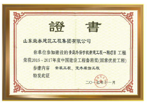 榮泰集團(tuán)以打造一流科技建設(shè)企業(yè)為目標(biāo),恪守“精心澆筑、真誠服務(wù)、信守合同、鑄就品牌”的質(zhì)量理念,踐行“客戶至上、微笑服務(wù)”的服務(wù)宗旨,落實(shí)安全與質(zhì)量主體責(zé)任,強(qiáng)化工程全過程管理,精心組織施工,集團(tuán)多次被評為“質(zhì)量信的過單位”,參建的“山東省青島第九中學(xué)(青島外語學(xué)校)新建工程一期項(xiàng)目”獲得“2016~2017建設(shè)工程魯班獎”,承建項(xiàng)目連續(xù)多年獲“泰山杯”“青島杯”、山東省建筑施工安全文明標(biāo)準(zhǔn)化優(yōu)良工地、青島市房屋建筑優(yōu)質(zhì)結(jié)構(gòu)工程獎等省、市級榮譽(yù)稱號。