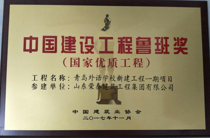 2017年11月6日,建筑業(yè)協(xié)會發(fā)布文件,山東榮泰建筑工程集團有限公司參建的“青島外語學校新建工程一期項目”獲得“2016~2017年度中國建設工程魯班獎(國家優(yōu)質工程)”。這一殊榮的獲得,見證著我集團在“實施品牌戰(zhàn)略、建設精品工程”的征途上又邁出了堅實的一步,是,也是全體榮泰人共同的榮耀!