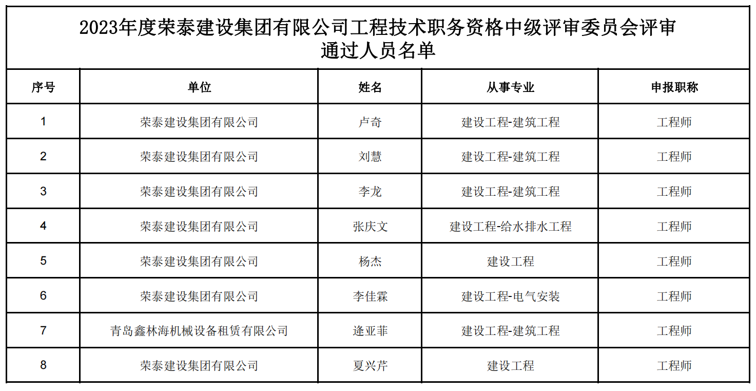 附件:2023年度榮泰建設(shè)集團(tuán)有限公司工程技術(shù)職務(wù)資格中級評審委員會評審?fù)ㄟ^人員名單