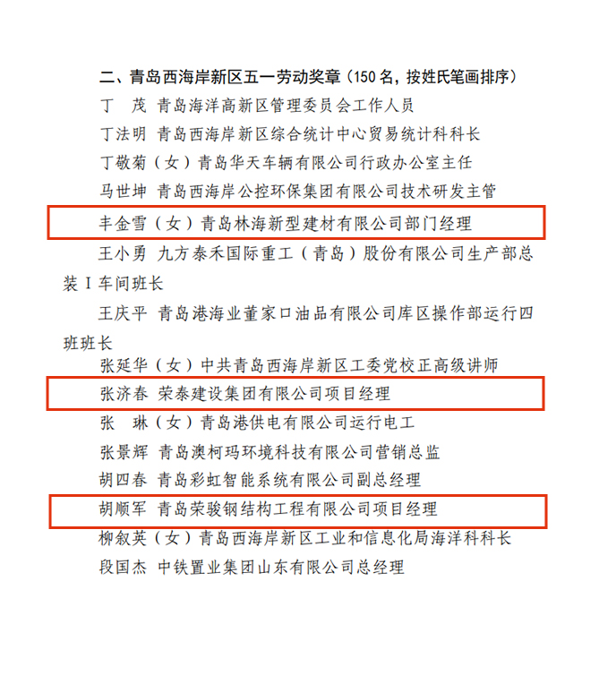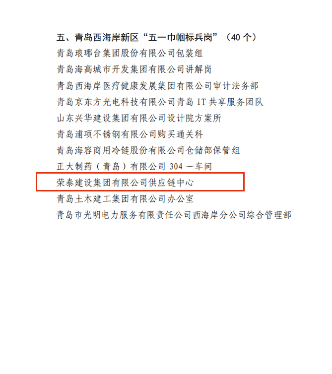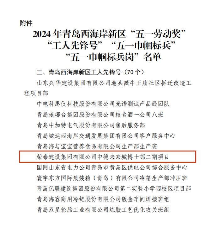 近日,西海岸新區(qū)總工會印發(fā)《關(guān)于公布 2024 年青島西海岸新區(qū)“五一勞動獎”“工人先鋒號”“五一巾幗標兵”“五一巾幗標兵崗”的通知》,隆重表彰了西海岸新區(qū)各行各業(yè)的先進集體和先進個人。榮泰建設(shè)集團2個集體、3名個人光榮上榜。